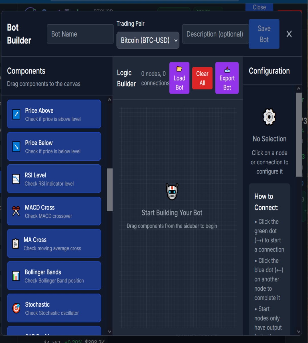 Build logic based crypto trading bots without coding. Drag and drop different market scanners to build your own strategy logic, simulate performance, and deploy instantly. This state machine bot builder helps you define custom strategies using conditions like RSI, EMA, price trends, and more—then executes trades automatically. Perfect for traders who want automation without complexity.…