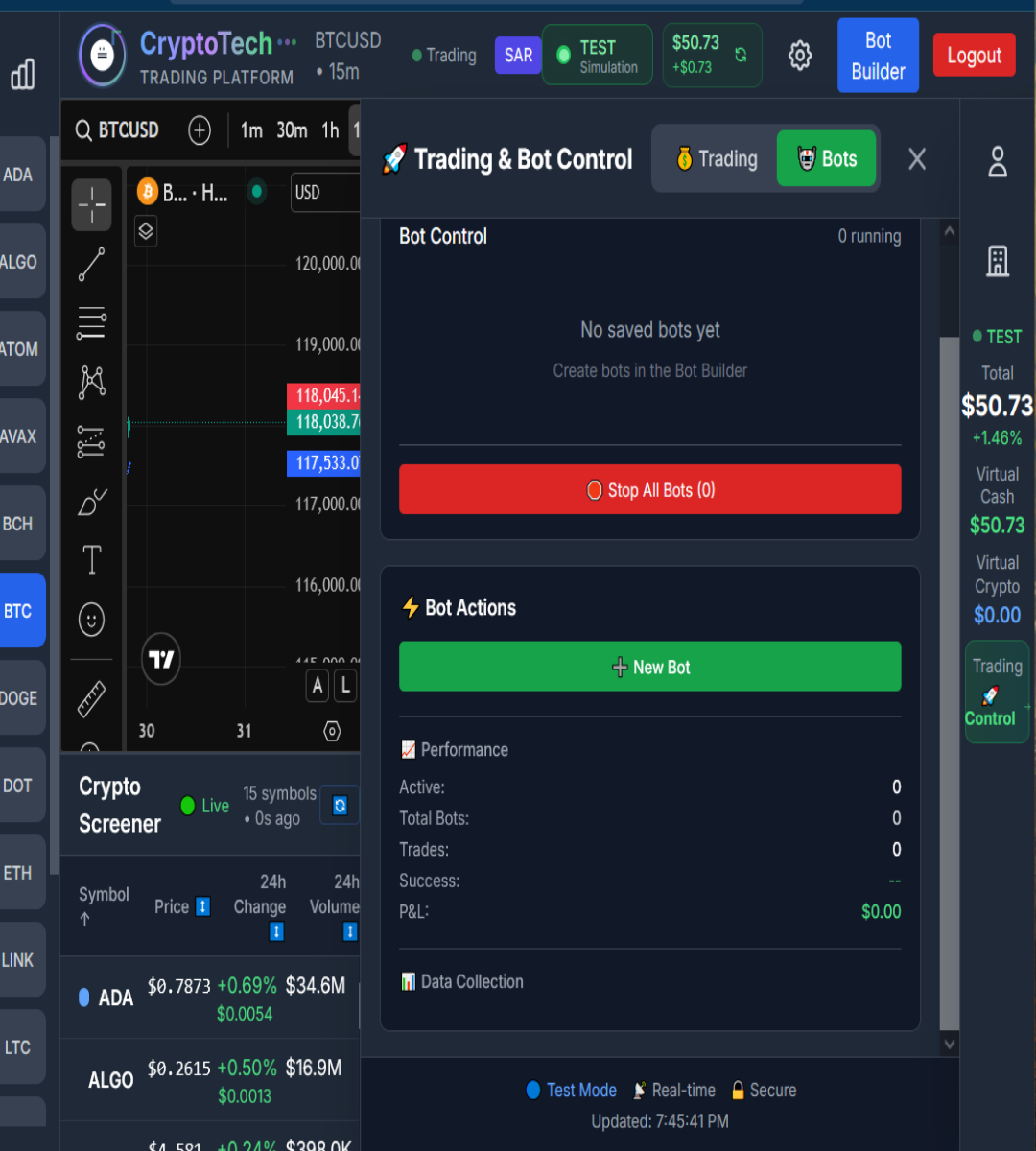 Simulation mode included: Run your bots in a risk-free test environment to simulate trades before going live. See how your logic responds in real-time without risking capital.